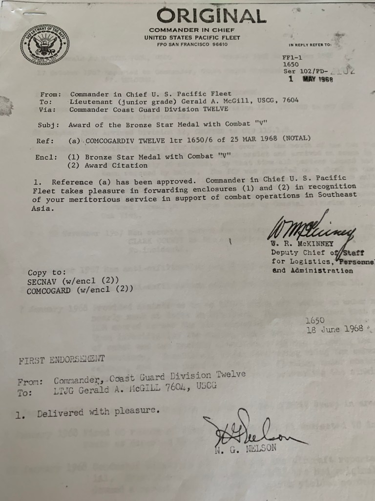 Lt (jg) Gerald McGill, Operation Market Time, USCGC Point Welcome Re: Award of Bronze Star Medal Date: November 6, 2019Author: Nobles in Hong Kong 0 Comments Share this: Click to share on X (Opens in new window) X Click to share on Facebook (Opens in new window) Facebook Click to share on Tumblr (Opens in new window) Tumblr Like Loading...
