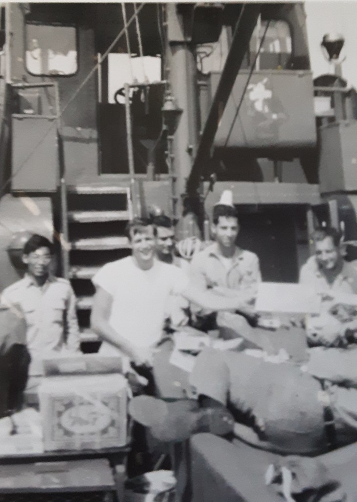Previously I wrote about our how we had mounted a lighted Christmas tree to the top of the rotating radar transmitter on the Pt. Welcome. I wanted to note that the wiring was done by our electronics technician, who was also our Vietnamese Liaison Officer. He is the man on the far left in this photo, which is another one I took on Christmas Day, 1967.